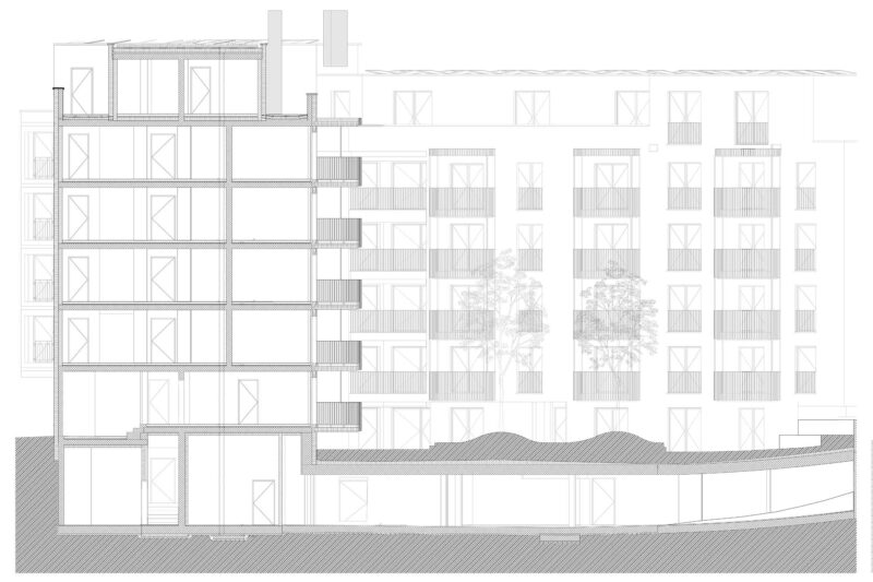 Durch das Zurückweichen an die Baulinie wird die Abwicklung der südseitigen Fassade und der Hofraum deutlich grösser. Dieser attraktive Innenhof dient der Bewohnerschaft als Aufenthalts- und Rückzugsort.