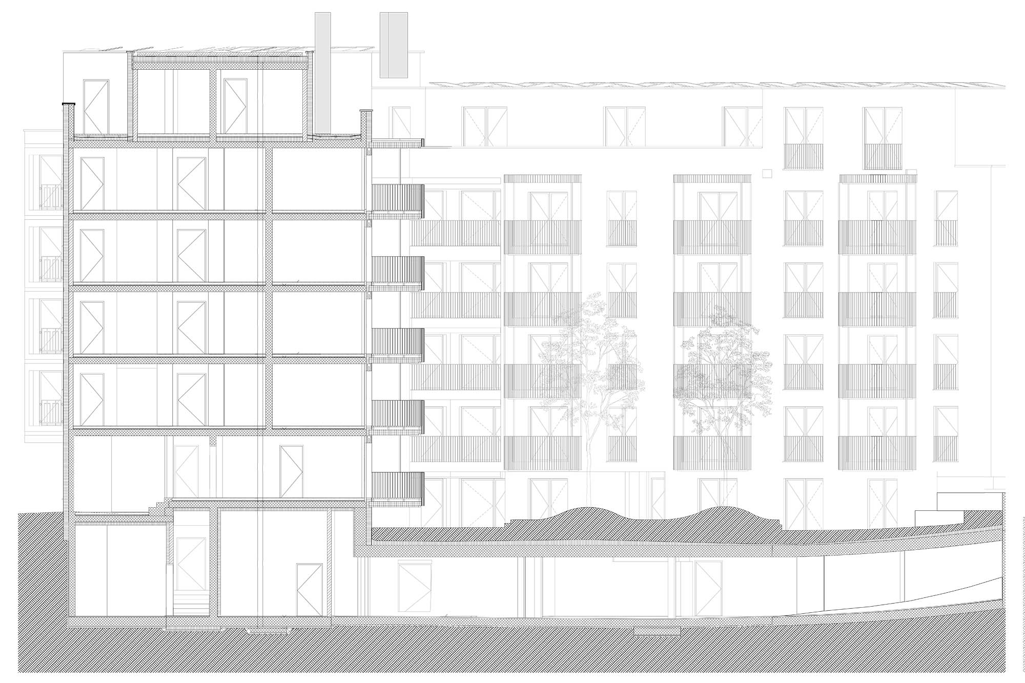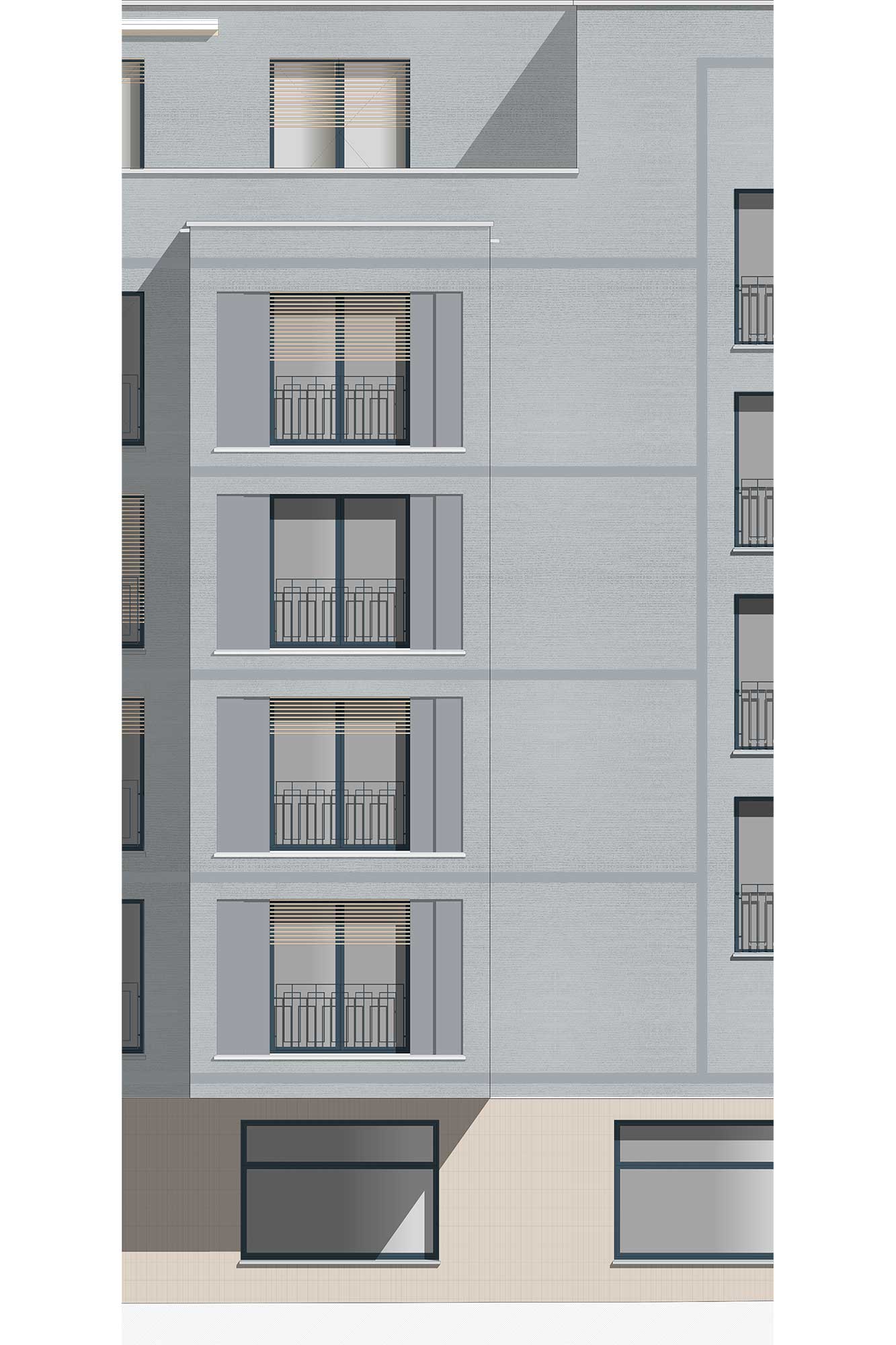 Ortstypische Elemente des Quartiers wurden übernommen und gewürdigt: Die repräsentative Strassenfassade mit Sockel und Hochparterre, die differenzierte Hoffassade, die Putzfassade, die Ausformulierung von Erkern sowie die durchgehende Traufhöhe.